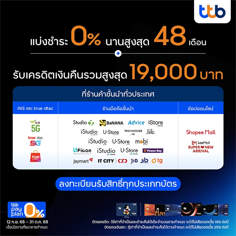 แบ่งชำระ 0% pay plan นานสูงสุด 10 เดือน สำหรับบัตรเครดิต ttb และนานสูงสุด 48 เดือน สำหรับบัตรกดเงินสด ttb