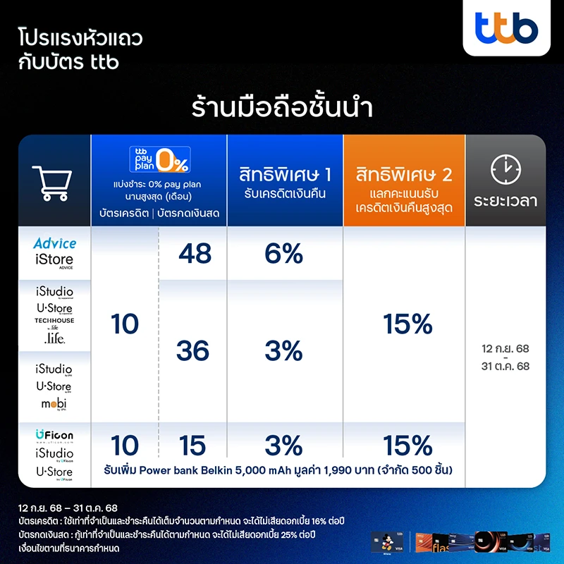 แบ่งชำระ 0% pay plan นานสูงสุด 10 เดือน สำหรับบัตรเครดิต ttb และนานสูงสุด 15 เดือน สำหรับบัตรกดเงินสด ttb