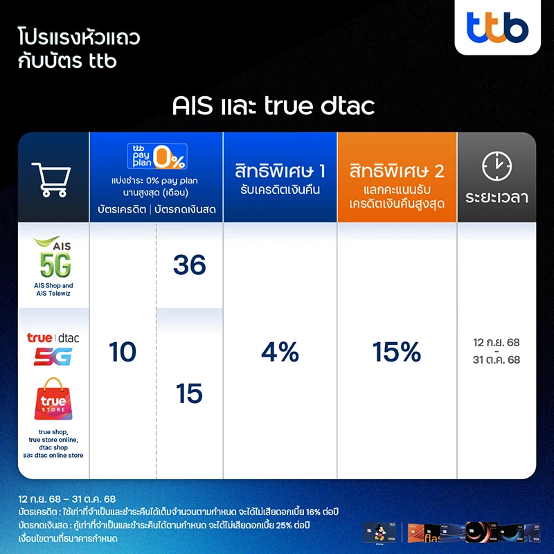 แบ่งชำระ 0% pay plan นานสูงสุด 10 เดือน สำหรับบัตรเครดิต ttb และนานสูงสุด 36 เดือน สำหรับบัตรกดเงินสด ttb