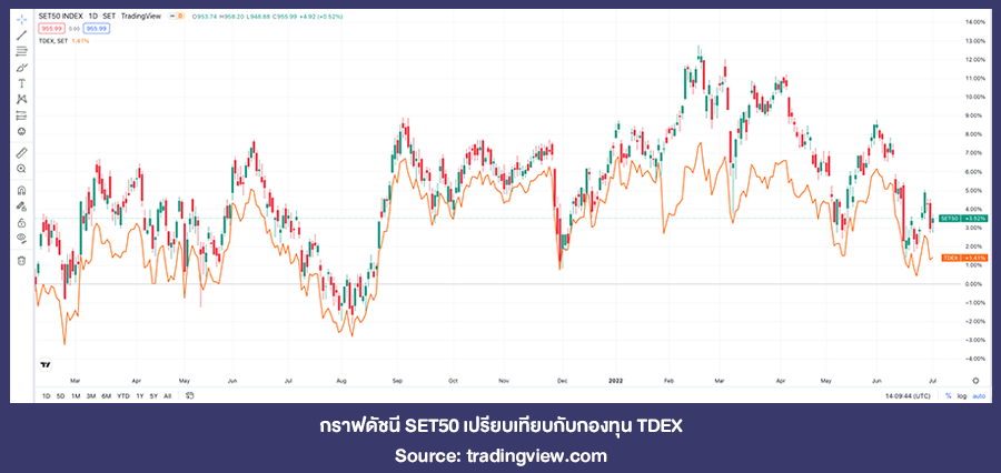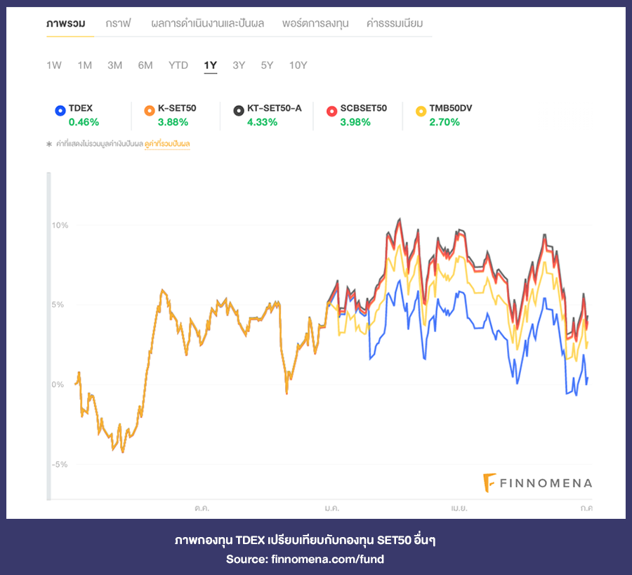 หลายๆ คนอาจจะสงสัยว่ากองทุนรวมเองก็มีกองทุนดัชนีอย่าง SET50 เหมือนกัน แล้วการซื้อ TDEX กับ SET50 จะแตกต่างกันอย่างไร จากภาพด้านล่างจะเห็นว่ากองทุน TDEX และกองทุน SET50 อื่นๆ ก็วิ่งไปในทิศทางเดียวกัน ดังนั้นความแตกต่างคือ TDEX มีการจ่ายปันผลเหมือนกับการถือครองหุ้นทั่วไป ซึ่งบางกองทุน SET50 ก็มีจ่ายปันผลเช่นกัน เช่น TMB50DV อีกความแตกต่าง คือ ค่าธรรมเนียม ถึงจะเป็น Passive Fund เหมือนกัน แต่ TDEX มีค่าธรรมเนียมที่ต่ำกว่า