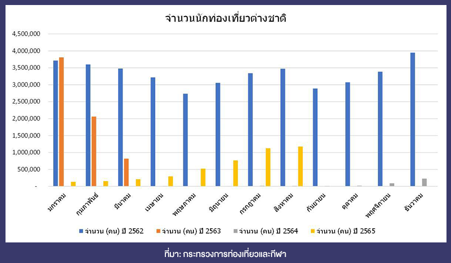 จำนวนนักท่องเที่ยวตั้งแต่เดือนมกราคม - สิงหาคม ปี 2565 อยู่ที่ 4,635,418 คน ส่วนเดือนมกราคม - สิงหาคม ปี 2564 มีจำนวนนักท่องเที่ยวทั้งหมดเพียง 73,608 คน แม้จำนวนจะเพิ่มขึ้นอย่างชัดเจน แต่ยังห่างไกลจากจำนวนนักท่องเที่ยวตั้งแต่เดือนมกราคม - สิงหาคม ปี 2562 ที่ยังไม่มีโควิด-19 ระบาด มีมากถึง 26,618,410 คน และจำนวนนักท่องเที่ยวทั้งปี 2562 อยู่ที่ 39,916,251 คน