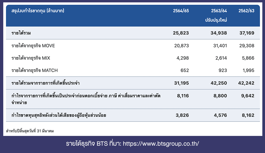 รายได้งวดปี 2564/2565 (เม.ย. 64-มี.ค. 65) อยู่ที่ 31,195 ล้านบาท รายได้จากธุรกิจ MOVE คิดเป็น 80.8% ธุรกิจ MIX คิดเป็น 16.6% และธุรกิจ MATCH คิดเป็น 2.5%
