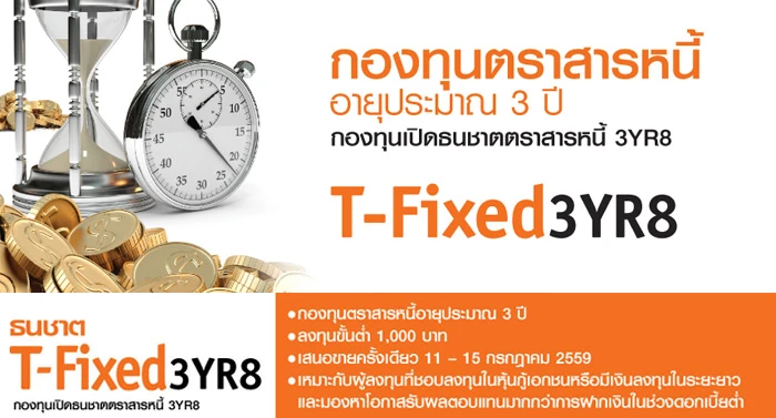 กองทุนเปิดธนชาตตราสารหนี้ T-Fixed3YR8 อายุประมาณ 3 ปี สร้างโอกาสรับผลตอบแทนมากกว่าการฝากเงินในช่วงดอกเบี้ยต่ำ ลงทุนขั้นต่ำ 1,000 บาท เสนอขายเพียงครั้งเดียว จนถึง 15 ก.ค. 59 นี้
