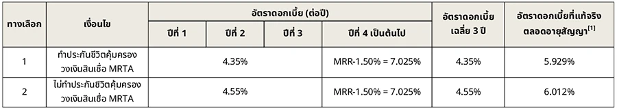 - ทางเลือกที่ 1 และ 3 : รับส่วนลดอัตราดอกเบี้ย 0.25% ต่อปี เฉพาะในปีที่ 1
