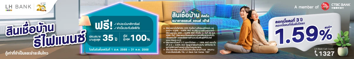 - อัตราดอกเบี้ย MLR = 7.65% ต่อปี (อ้างอิงประกาศธนาคาร ณ วันที่ 18 ส.ค. 2568) ทั้งนี้ อัตราดอกเบี้ยลอยตัวสามารถเปลี่ยนแปลงเพิ่มขึ้น หรือลดลงได้