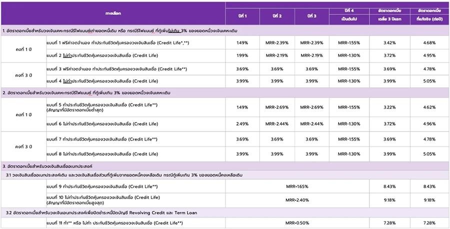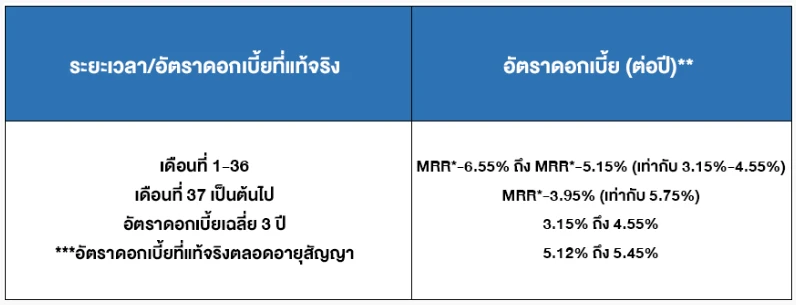 - *อัตราดอกเบี้ยดังกล่าวสามารถเปลี่ยนแปลงได้ตามการขึ้น/ลงของอัตราดอกเบี้ย MRR และโปรโมชันอัตราดอกเบี้ยของธนาคาร ณ ขณะนั้นๆ