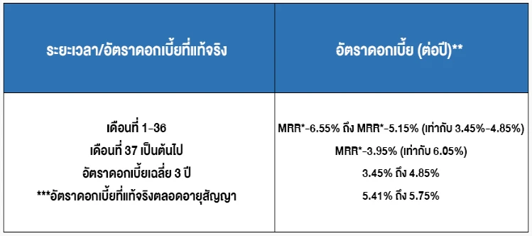 - *อัตราดอกเบี้ยดังกล่าวสามารถเปลี่ยนแปลงได้ตามการขึ้น/ลงของอัตราดอกเบี้ย MRR และโปรโมชันอัตราดอกเบี้ยของธนาคาร ณ ขณะนั้นๆ