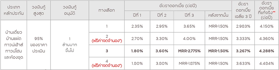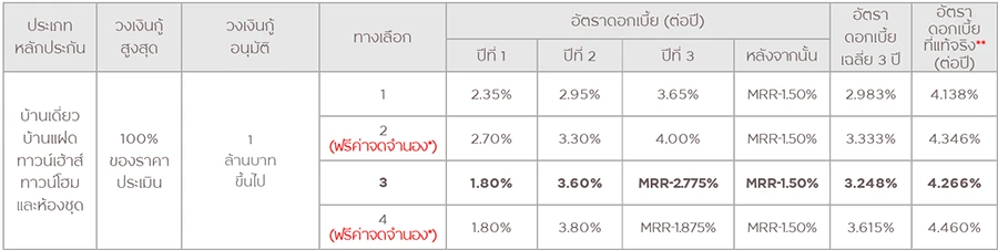 - ทางเลือกที่ 2 และ 4 : ฟรีค่าจดจำนองตามเงื่อนไขที่กำหนด*