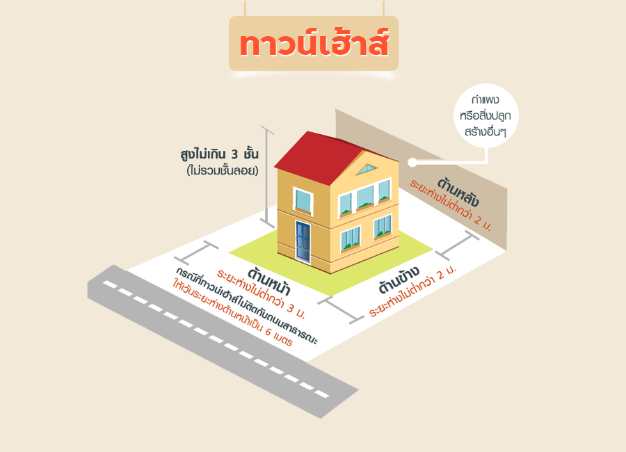 "ทาวน์เฮ้าส์" หรือ บ้านแถว คือที่อยู่อาศัยที่สร้างติดกันหลายหลัง มีผนังติดกันทั้งสองด้าน จึงมีราคาถูกกว่าบ้านแฝด ส่วนใหญ่มี 2 ชั้น หรือชั้นเดียวก็ได้ ตามกฎหมายทาวน์เฮ้าส์ต้องมีขนาดที่ดินไม่ต่ำกว่า 16 ตารางวา มีหน้ากว้างไม่ต่ำกว่า 4 เมตร ลึกไม่เกิน 24 เมตร ทาวน์เฮ้าส์ที่ปลูกเป็นแนวยาว อาจมีตั้งแต่ชั้นเดียวขึ้นไป แต่ต้องไม่เกิน 3 ชั้น (ไม่นับชั้นลอย) ความยาวที่สร้างต่อเนื่องกันในหนึ่งแถวต้องไม่เกิน 40 เมตร ด้านหน้าเว้นไม่ต่ำกว่า 3 เมตร ด้านข้างและหลังเว้นไม่ต่ำกว่า 2 เมตร กรณีที่ทาวน์เฮ้าส์ไม่ติดถนนสาธารณะ ให้เพิ่มระยะด้านหน้าเป็น 6 เมตร