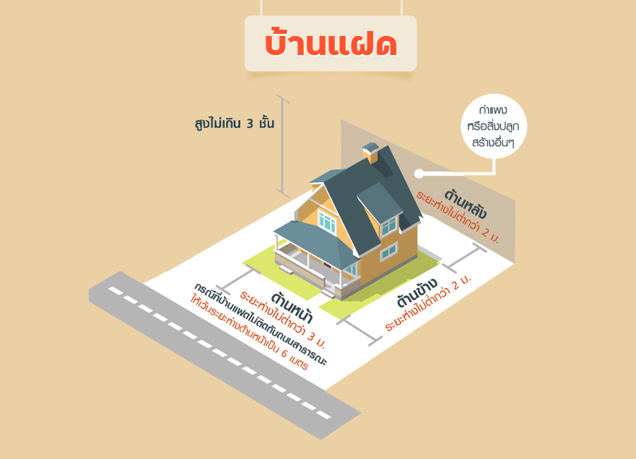 "บ้านแฝด" คือบ้านที่สร้างขึ้นเป็นคู่ มีลักษณะเหมือนกันทั้งสองหลัง มีส่วนของบ้านด้านหนึ่ง (ฝาบ้าน) ติดกัน หรือส่วนอื่นติดกันก็ได้ กฎหมายกำหนดให้บ้านแฝดต้องมีขนาดที่ดินไม่ต่ำกว่า 35 ตารางวา ความกว้างของที่ดินสองหลังไม่ต่ำกว่า 16 เมตร โดยแบ่งข้างละ 8 เมตร สูงไม่เกิน 3 ชั้น บ้านแฝดจะมีบริเวณคล้ายบ้านเดี่ยวแต่น้อยกว่า การเว้นระยะด้านหน้าเว้นไม่ต่ำกว่า 3 เมตร ด้านข้างและด้านหลังหลังเว้นไม่ต่ำกว่า 2 เมตร กรณีที่บ้านแฝดไม่ติดถนนสาธารณะ ให้เพิ่มระยะด้านหน้าเป็น 6 เมตร