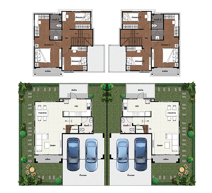 ตัวอย่างบ้านแฝด 2 ชั้น ที่มีผนังส่วนหนึ่งติดกัน