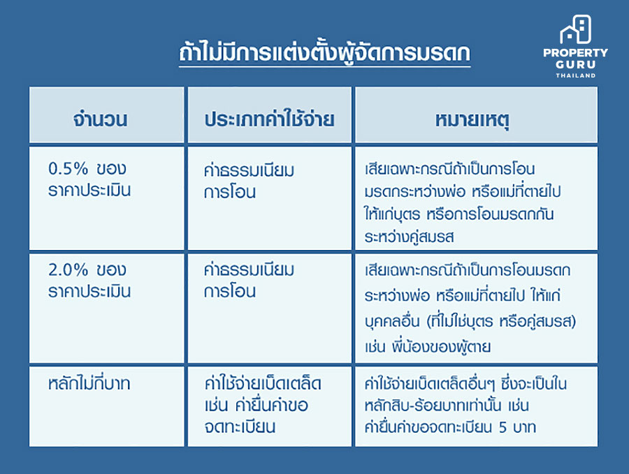 (ข) วิธีที่สอง - แต่ถ้าเรายังไม่มีเงิน หรือยังไม่อยากเสียค่าธรรมเนียมเต็มตามข้อ (ก) ข้างต้น หรือต้องการเตรียมขายต่อเพื่อไม่ให้เสียค่าธรรมเนียมหลายต่อ เราสามารถให้ผู้จัดการมรดกเดินเรื่อง "จดทะเบียนลงชื่อผู้จัดการมรดกในหนังสือแสดงสิทธิในที่ดิน" บ้านหรือคอนโดนั้นให้เป็นชื่อของ "ผู้จัดการมรดก" ไว้ก่อนได้ โดยจะต้องทำตามกระบวนการของกรมที่ดิน (มาตรา 82 ประมวลกฎหมายที่ดิน) ส่วนค่าใช้จ่าย และค่าธรรมเนียมในกรณีนี้จะถือเป็นการจดทะเบียนประเภทไม่มีทุนทรัพย์ ซึ่งจะต่ำกว่าวิธีแรกเยอะ โดยมีรายละเอียดดังนี้