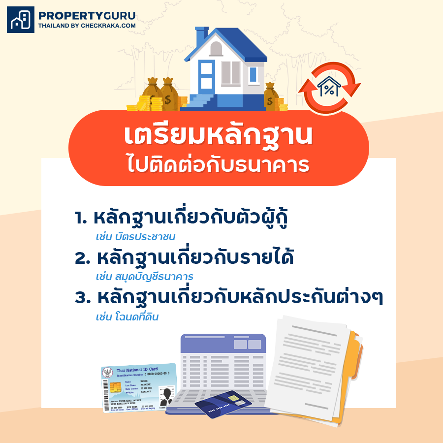 เมื่อเราได้เป้าหมายของธนาคารที่เราคิดจะรีไฟแนนซ์แล้ว ก็ต้องเตรียมเอกสารหลักฐานให้พร้อม โดยเอกสารหลักฐานหลักๆ มีดังต่อไปนี้