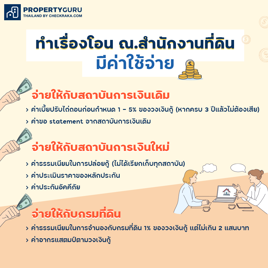จากนั้นจะทำเรื่องโอน ณ.สำนักงานที่ดินในเขตที่สินทรัพย์ หรือบ้านของเราตั้งอยู่ โดยธนาคารใหม่จะนำสัญญาไปให้เราเซ็นที่สำนักงานที่ดิน ธนาคารใหม่จะออกเช็คจ่ายให้กับธนาคารเก่า ธนาคารเก่าจะมอบโฉนดที่ได้มาจากสำนักงานที่ดินให้กับธนาคารใหม่ เป็นอันเสร็จสิ้นการโอน โดยมีค่าใช้จ่ายต่าง ๆ ดังนี้