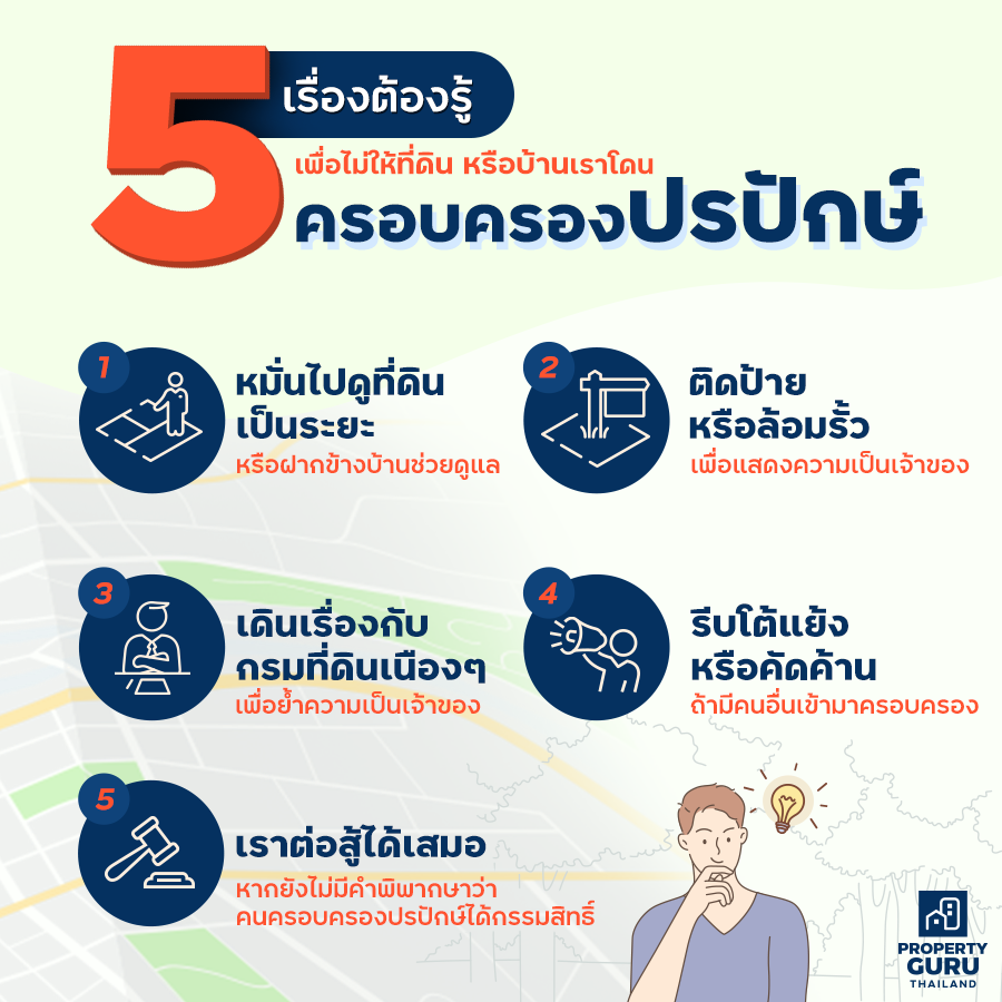 4. หากมีคนอื่นเข้ามาครอบครอง ให้รีบคัดค้าน หรือโต้แย้งทันที ซึ่งเมื่อคัดค้าน หรือโต้แย้งแล้ว อาจมีบทสรุปได้หลายอย่าง เช่น คนที่เข้ามาครอบครองนั้นยินดีย้ายออกแต่โดยดี หรือหากเค้าอยากใช้ที่ดินต่อ ก็อาจขอทำสัญญาเช่าที่ดินจากเรา หรือ Worst Case สุดท้ายตกลงกันไม่ได้ เจ้าของที่ดินคงต้องฟ้องขับไล่คนที่เข้ามาครอบครองนั้น