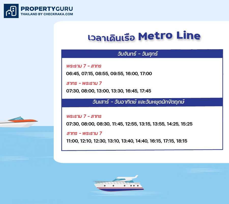 เวลาเดินเรือสาย Metro Line วันจันทร์-ศุกร์ เวลา 06.45 น.-17.45 น. และวันหยุด 07.30 น.-18.15 น.