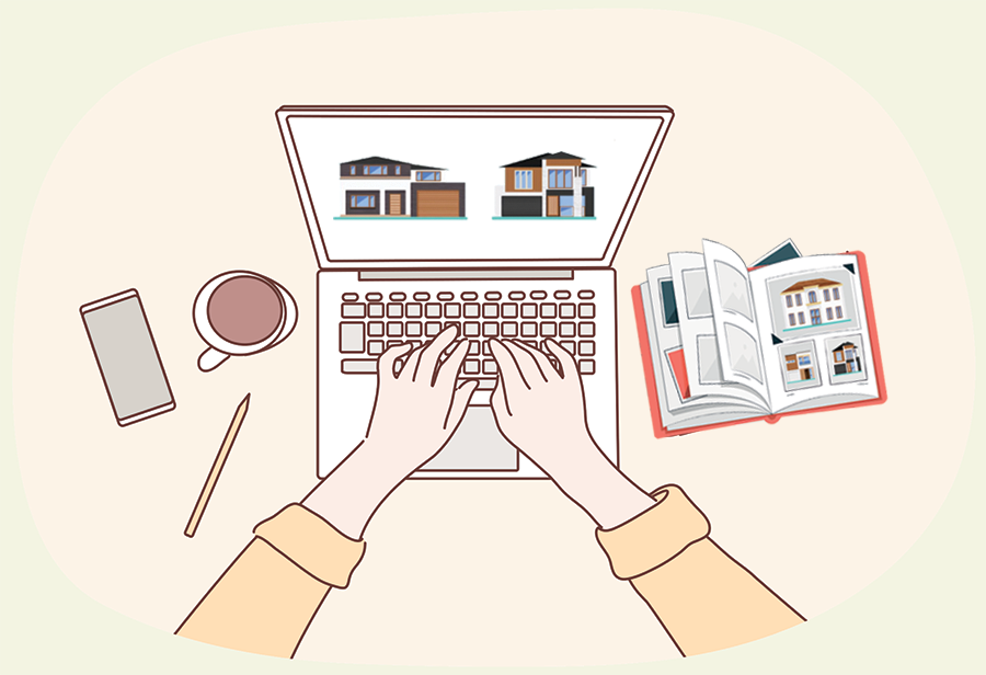 ปัจจุบันการหาแบบบ้านสวยๆ สามารถทำได้ง่ายมาก และมีหลากหลายช่องทาง ไม่จะเป็นการเสิร์ชหาข้อมูลจากเว็บไซต์ เช่น แบบบ้านฟรีจากสำนักงานกรมโยธา กทม., แบบบ้านฟรีจาก ธอส. ฯลฯ หรืออาจดูได้จากหนังสือรวมแบบบ้าน ดูจากโบชัวร์ที่แจกตามโครงการบ้านจัดสรร แต่ถ้าหากอยากได้แบบบ้านที่มีรายละเอียดมากขึ้นมาหน่อย ก็สามารถขอได้จากสำนักงานเขต หรือ อบต. ก็ได้ แต่ก็ต้องยอมรับว่ารูปแบบการจัดวางห้อง ขนาดพื้นที่ แม้กระทั้งตัวบ้านเอง อาจจะไม่เข้ากับที่ดินที่เรามีซะทีเดียว จำเป็นจะต้องปรับเปลี่ยนเพื่อให้ลงตัวกับที่ดินของเรามากที่สุด และแบบบ้านสำเร็จรูปเหล่านี้ก็เป็นเพียงแค่แนวทางคร่าวๆ เท่านั้น เพราะยังไงก็ต้องไปจ้างทีมออกแบบให้เขียนแบบโดยละเอียดเพื่อใช้ในการขออนุญาต และใช้ในงานก่อสร้างจริงอยู่ดี