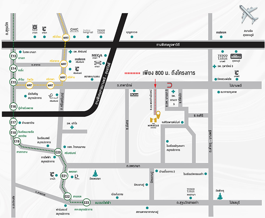 Extra Location : ตัวโครงการตั้งอยู่ภายในซอยพรสว่างนิเวศน์ ห่างจากถนนเทพารักษ์เพียง 800 เมตร ใกล้ทางด่วนวงแหวนกาญจนาภิเษกบางนา เพียง 5 นาที ใกล้ถนนสายหลัก อาทิ ถนนเส้นหลักเทพารักษ์ เชื่อมต่อถนนแพรกษา, ถนนศรีนครินทร์, ถนนตำหรุ-บางพลี เป็นทำเลที่สะดวกทุกการเดินทาง ใกล้รถไฟฟ้าสายสีเขียว และอีกไม่นานก็จะมีรถไฟฟ้าสายสีเหลือง ใกล้ห้างสรรพสินค้าชั้นนำ บิ๊กซี บางพลี, โลตัส บางพลี และ เมกะ บางนา