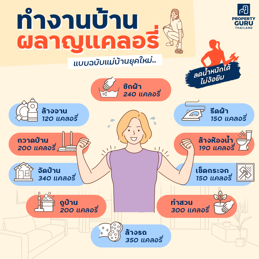ใครว่าการ "ออกกำลังกาย" จะต้องเข้าฟิตเนสหรือเข้ายิมเสมอไป การอยู่ที่บ้านก็สามารถออกกำลังกาย ลดน้ำหนัก ฟิตหุ่นให้สวยแซ่บได้เช่นกัน เคยได้ยินมั้ยคะ "แค่ขยับก็เท่ากับออกกำลังกาย" ดังนั้นการ "ทำงานบ้าน" อย่างการปัด กวาด เช็ด ถูก ซึ่งเป็นกิจกรรมที่คุณแม่บ้านต้องทำเป็นประจำอยู่แล้วนั่นแหละค่ะคือการออกกำลังกายดีๆ นี่เอง เพราะนอกจากจะทำให้บ้านสะอาดแล้วยังช่วยเผาผลาญแคลอรี่ได้มากถึง 200-400 แคลลอรี่ เลยทีเดียว เทียบเท่ากับการวิ่ง 30 นาที แล้วกิจกรรมไหนจะช่วยเผาผลาญแคลอรี่ได้เท่าไหร่บ้างไปดูกันเลย...