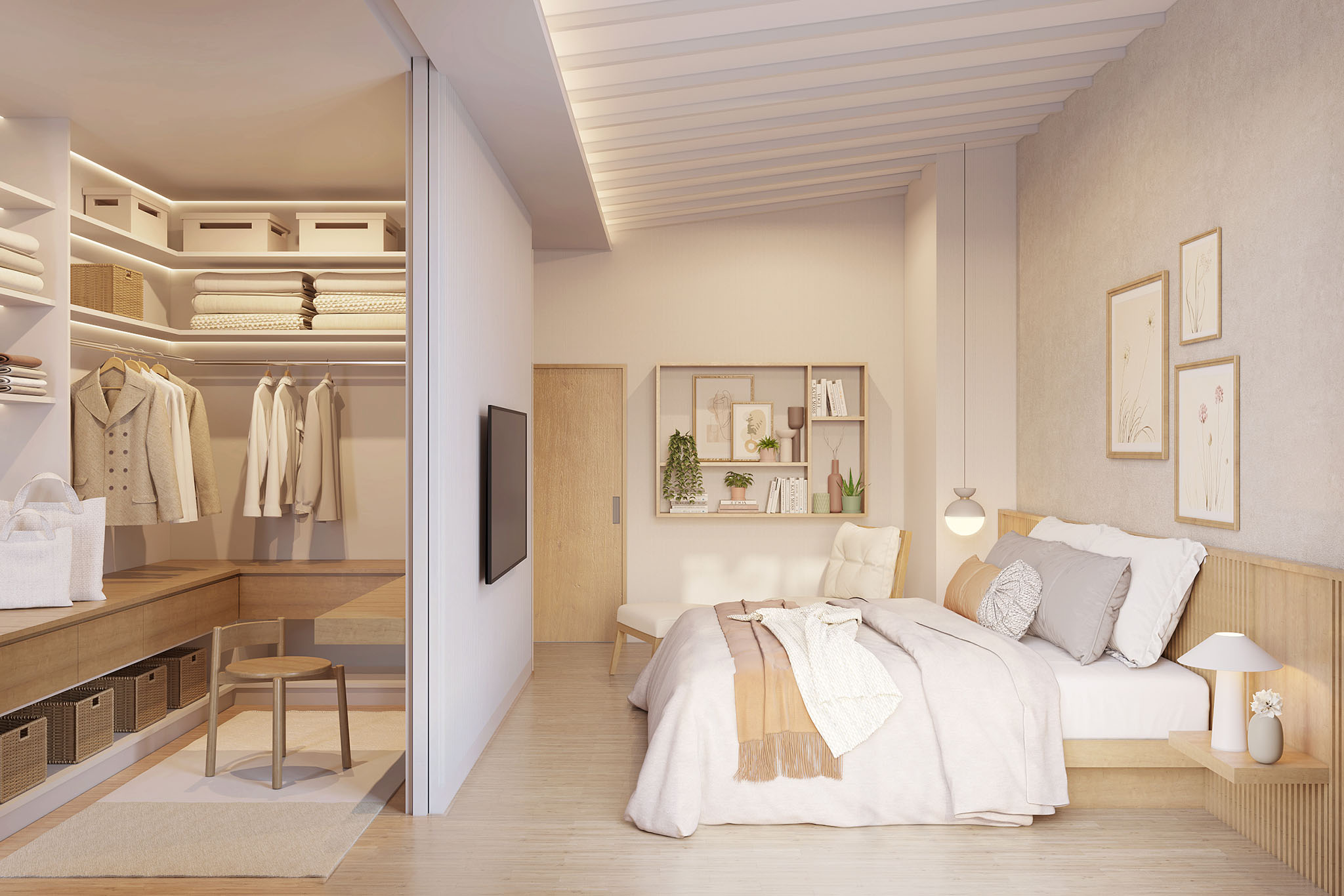 - Double master bedroom : ทาวน์โฮม 2 ชั้น พื้นที่ใช้สอย 115 ตร.ม. ที่ดินเริ่มต้น 18 ตร.วา. 2 ห้องนอน 2 ห้องน้ำ ที่จอดรถ 2 คัน