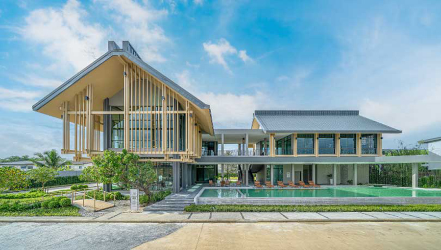 ที่สุดของบ้านมินิมอล ทางโครงการมีแบบบ้านด้วยกัน 2 แบบ- แบบแรกบ้านเดี่ยว สระว่ายน้ำส่วนตัวกลางบ้าน : พื้นที่ใช้สอยขนาด 251 ตร.ม. 2 ห้องนอนขนาดใหญ่ มาพร้อม 3 ที่จอดรถ (เพดานสูงพิเศษ Double Volume)