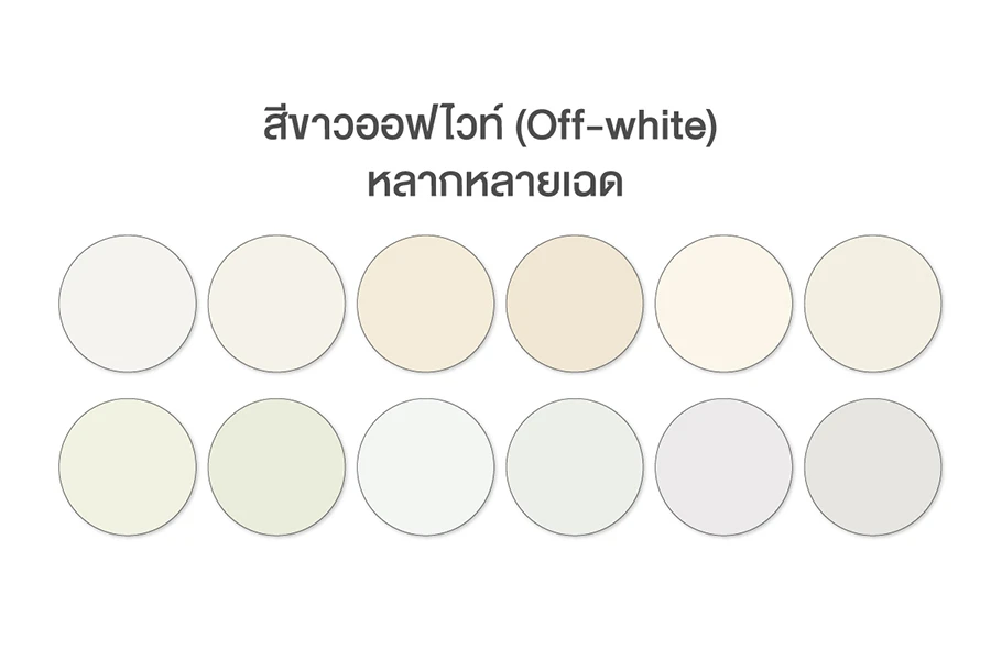 สีขาวมีอยู่หลายเฉดมาก แต่ขาวที่ไม่ใช่ขาวจั๊วะ จะสามารถเรียกกลุ่มนี้ได้ว่า Off- White คือสีขาวที่มีสีอื่นๆ ผสมอยู่เล็กน้อย เพื่อลดค่าสะท้อนแสงลงทำให้เกิดเฉดสีขาวมากมายหลายร้อยเฉด ทำให้เกิดเป็นขาวที่นุ่มนวล สบายตามากขึ้น โดยแบ่งออกเป็น 2 โทนใหญ่ๆก็คือ สีขาวโทนเย็น (ขาว+เทา ฟ้า เขียว น้ำเงิน) และสีขาวโทนอุ่น (ขาว+แดง เหลือง ส้ม น้ำตาล)