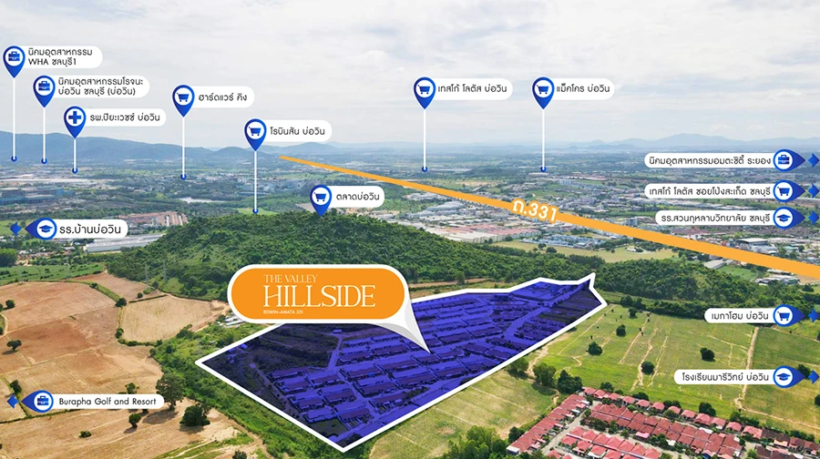 โครงการเดอะวัลเลย์ ฮิลล์ไซด์ อมตะ-บ่อวิน 331 ตั้งอยู่ที่ 88/10 หมู่ที่ 3 ถนนทางหลวง 331 ต.บ่อวิน อ.ศรีราชา จ.ชลบุรี สามารถรับชมวิวเขาธรรมชาติได้แบบ 360 องศา ให้ทุกการผักผ่อนลึกซึ้งยิ่งขึ้น แต่ในขณะเดียวกันก็ยังใกล้สิ่งอำนวยความสะดวกครบ เช่น ห้างโรบินสัน ตลาดบ่อวิน เทสโก้ แมคโคร โรงเรียนสวนกุหลาบวิทยาลัย ชลบุรี โรงเรียนมารีวิทย์ บ่อวิน อีกทั้งเจ็บป่วยก็หายห่วงเพราะไม่ไกลจากโรงพยาบาล ปิยเวชช์ บ่อวิน