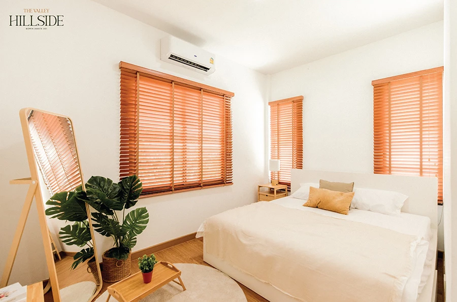 การพักผ่อนที่สำคัญที่สุดนั่นก็คือการนอน เตียงเปรียบเหมือนที่ชาร์จพลังงานของเรา นอกจากนั้นแล้วบรรยากาศในห้องนอนก็ส่งผลต่อการหลับสนิทด้วย เช่น การใช้โทนสีห้องนอนอ่อนๆ เช่น สีขาวหรือสีครีมจะช่วยให้ผู้อยู่อาศัยรู้สึกผ่อนคลาย มาพร้อมหน้าต่างรอบห้องที่รับแสงและลมจากธรรมชาติได้ในเวลากลางวัน ช่วยลดการใช้ไฟไปในตัว