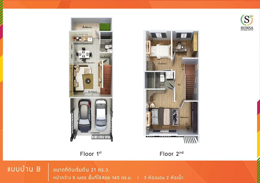 แบบบ้าน B หน้ากว้าง 5 เมตร พื้นที่ใช้สอยขนาด 140 ม.