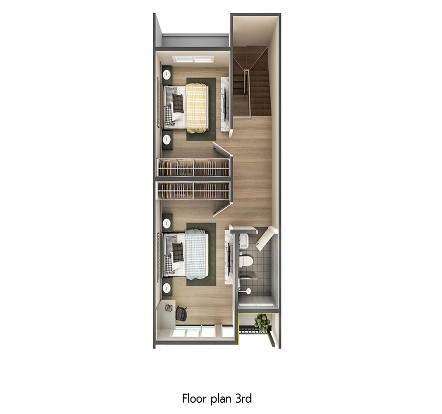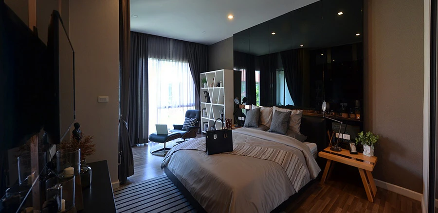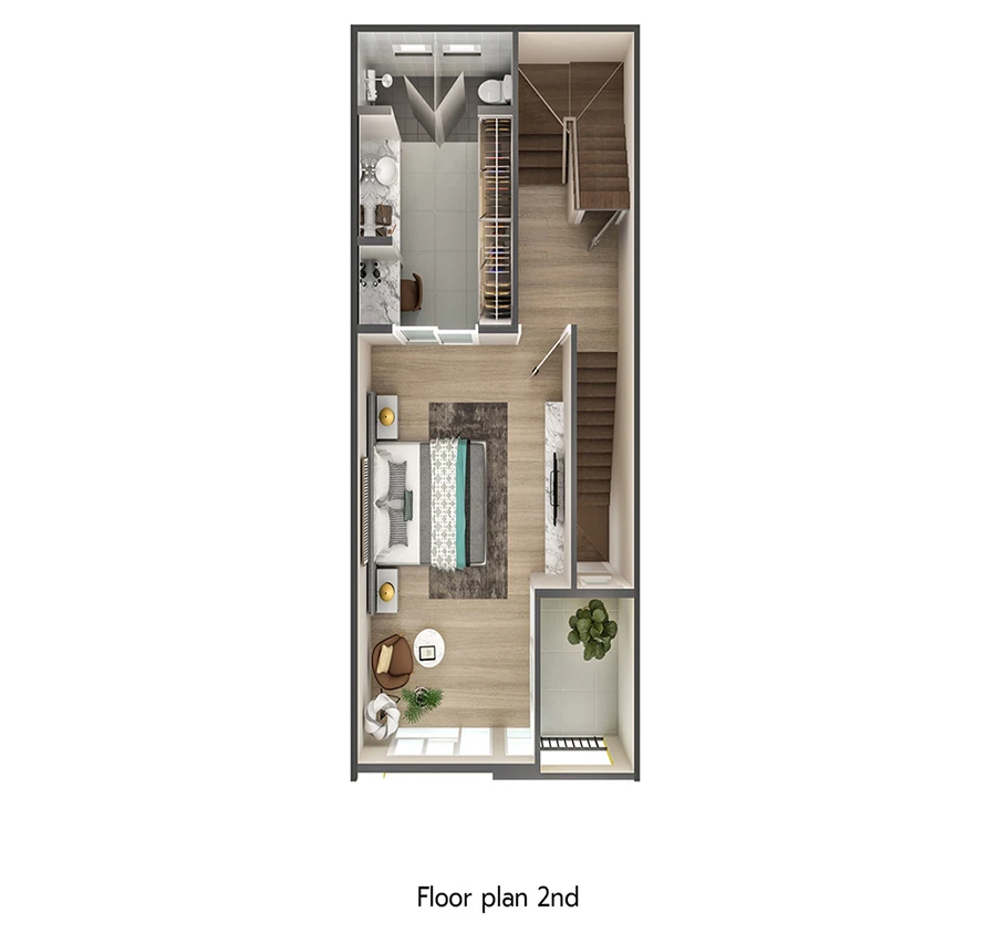 - Master Bedroom ออกแบบพื้นที่ให้เต็มทั้งชั้นสอง สามารถวางเตียง King Size วางโต๊ะทำงานหรือโซฟาได้ พร้อมกั้นส่วน Walk-in closet มีห้องน้ำในตัว และยังมีระเบียงแบบ Semi outdoor ให้อีกด้วย