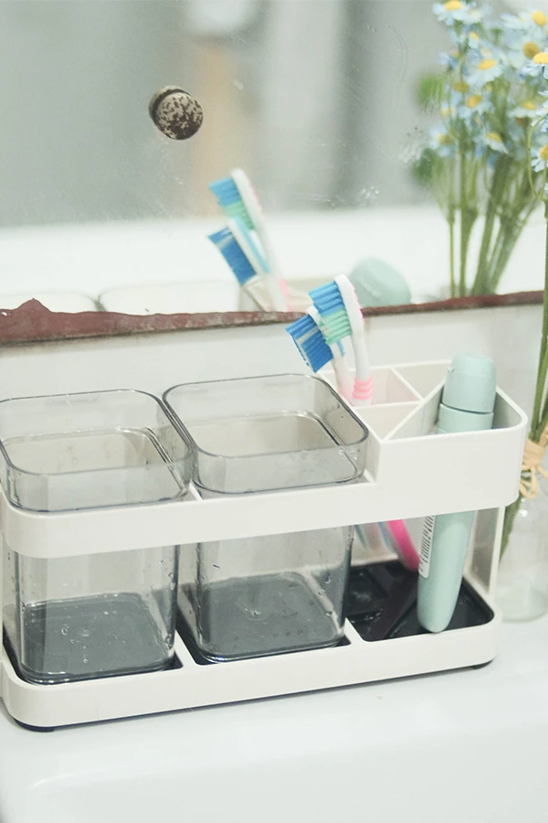 อุปกรณ์สำคัญในทุกๆ วันนั่นก็คือ แปรงสีฟัน ยิ่งคู่ไหนตื่นนอนและนอนพร้อมกัน ต้องมีอันนี้เลย ที่วางแปรงพร้อมแก้วน้ำ เพราะเป็นของที่ใช้ได้พร้อมกันในทุกเช้าและก่อนนอน และแก้ว 2 ใบ ให้เราได้ใช้กับคู่ของเราพอดี ส่วนด้านข้างจะมีช่องสำหรับวางแปรงและยาสีฟันครบในอันเดียว