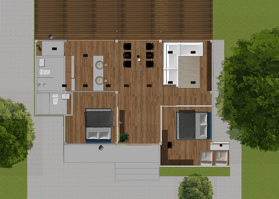 บ้านหลังนี้คุณส้มออกแบบเอง โดยมีภาพในหัวอยู่แล้วว่าอยากบ้านวางตรงจุดไหนจะได้วิวดีที่สุด จากนั้นแล้วจึงมา ‘ออกแบบตามไลฟ์สไตล์ของคนอยู่’ มีพื้นที่ใช้สอยภายประมาณ 85 ตร.ม. ที่เหลือเป็นพื้นทีระเบียงหลังบ้าน 40 ตร.ม. บ้านหลังนี้จึงมีแค่ 2 ห้องนอน 2 ห้องน้ำ ส่วนที่เหลือเป็นโถงนั่งเล่นที่สามารถปรับเปลี่ยนฟังก์ชันได้ เช่น เป็นโถงนอนเวลามีญาติมาเยี่ยม เป็นต้น