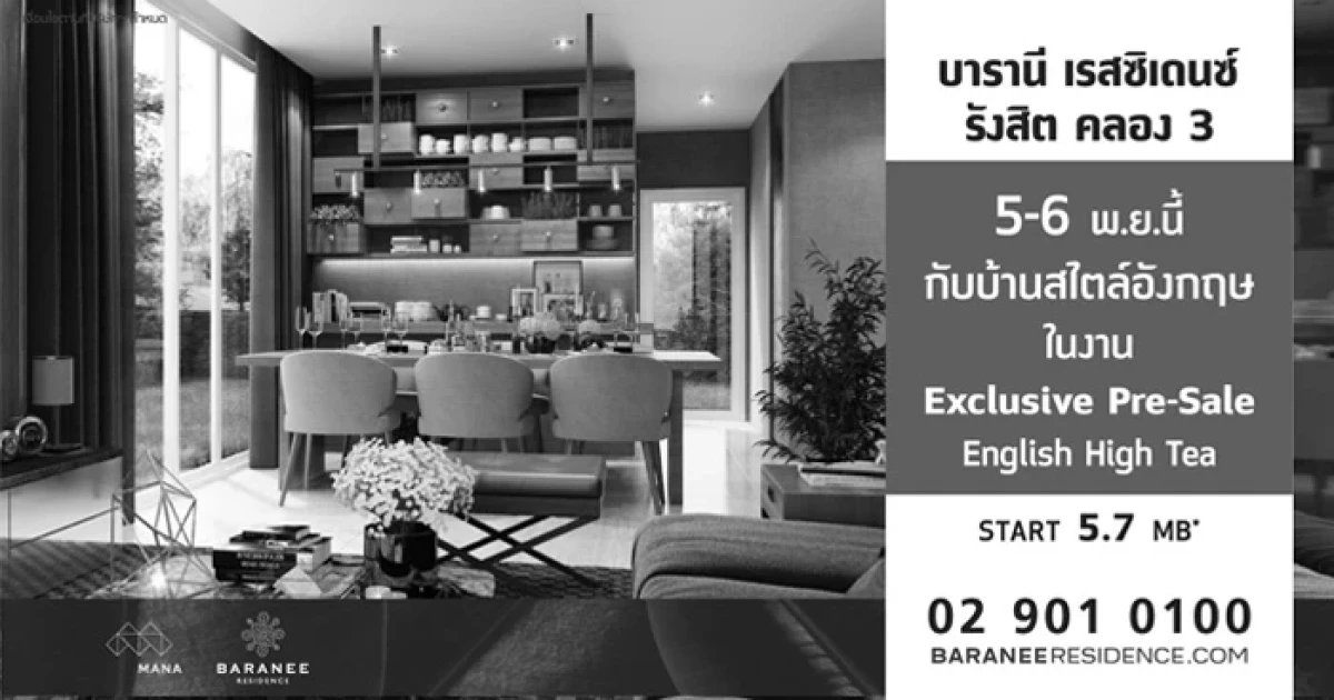 บารานี เรสซิเดนซ์ รังสิต คลอง 3 Exclusive Pre-Sale 5 - 6 พ.ย. นี้ เริ่ม 5.7 ล้านบาท