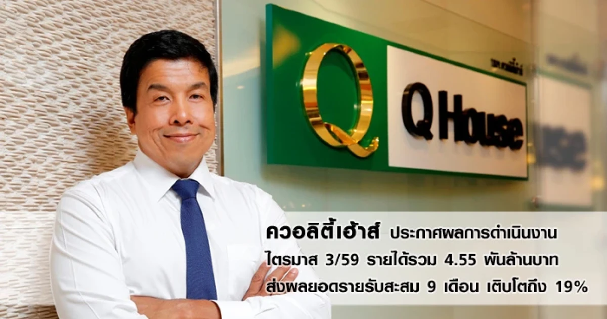 บริษัท ควอลิตี้เฮ้าส์ จำกัด (มหาชน) ผู้พัฒนาอสังหาริมทรัพย์ชั้นนำ เผยผลประกอบการไตรมาส 3 ประจำปี 2559 รายได้รวม 4,550 ล้านบาท เติบโต 5% ส่งผลให้มีรายได้รวมสะสม 9 เดือน 15,326 ล้านบาท เติบโต 19% จากช่วงเวลาเดียวกันของปีก่อน โดยในไตรมาส 3/59 มีกำไรสุทธิ 768 ล้านบาท เติบโต 35% และมีกำไรรวมสะสม 9 เดือน 2,407 ล้านบาท เติบโต 33% จากช่วงเวลาเดียวกันของปีก่อน