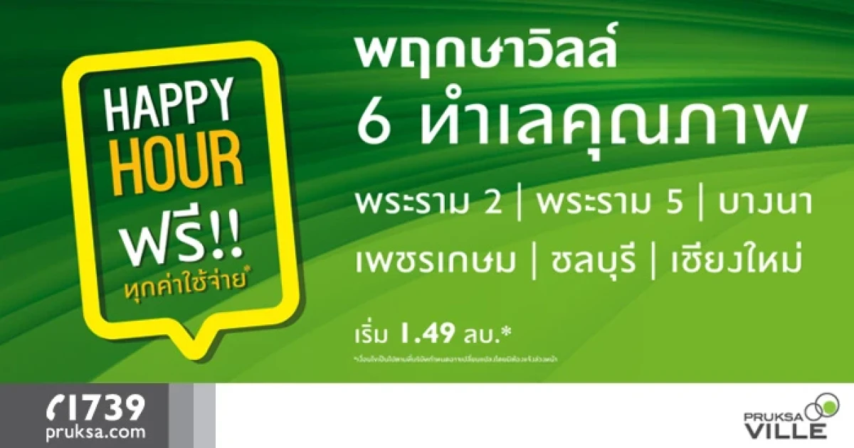 บริษัท พฤกษา เรียลเอสเตท จำกัด (มหาชน) จัดโปรโมชั่น Happy Hour ฟรี! ทุกค่าใช้จ่าย กับทาวน์โฮม พฤกษาวิลล์ 6 ทำเลคุณภาพ ได้แก่ พระราม 5, พระราม 2, บางนา, เพชรเกษม, ชลบุรี และเชียงใหม่ เริ่ม 1.49 ล้านบาท พบกันที่ Sales Gallery ของแต่ละโครงการ พร้อมเปิดให้ลงทะเบียนเพื่อรับสิทธิพิเศษก่อนใคร