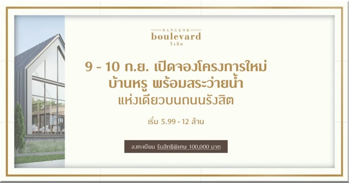 บริษัท เอสซี แอสเสท คอร์ปอเรชั่น จำกัด (มหาชน) เปิดให้จองบ้านใหม่ โครงการ "บางกอก บูเลอวาร์ด รังสิต (Bangkok boulevard Rangsit)" บ้านหรู พร้อมสระว่ายน้ำ แห่งเดียวบนถนนรังสิต เปิดให้ลงทะเบียนผ่านเว็บไซต์ เพื่อรับสิทธิพิเศษถึง 100,000 บาท ผู้ที่สนใจสามารถลงทะเบียนได้ที่ลิงก์ด้านล่างนี้ค่ะ