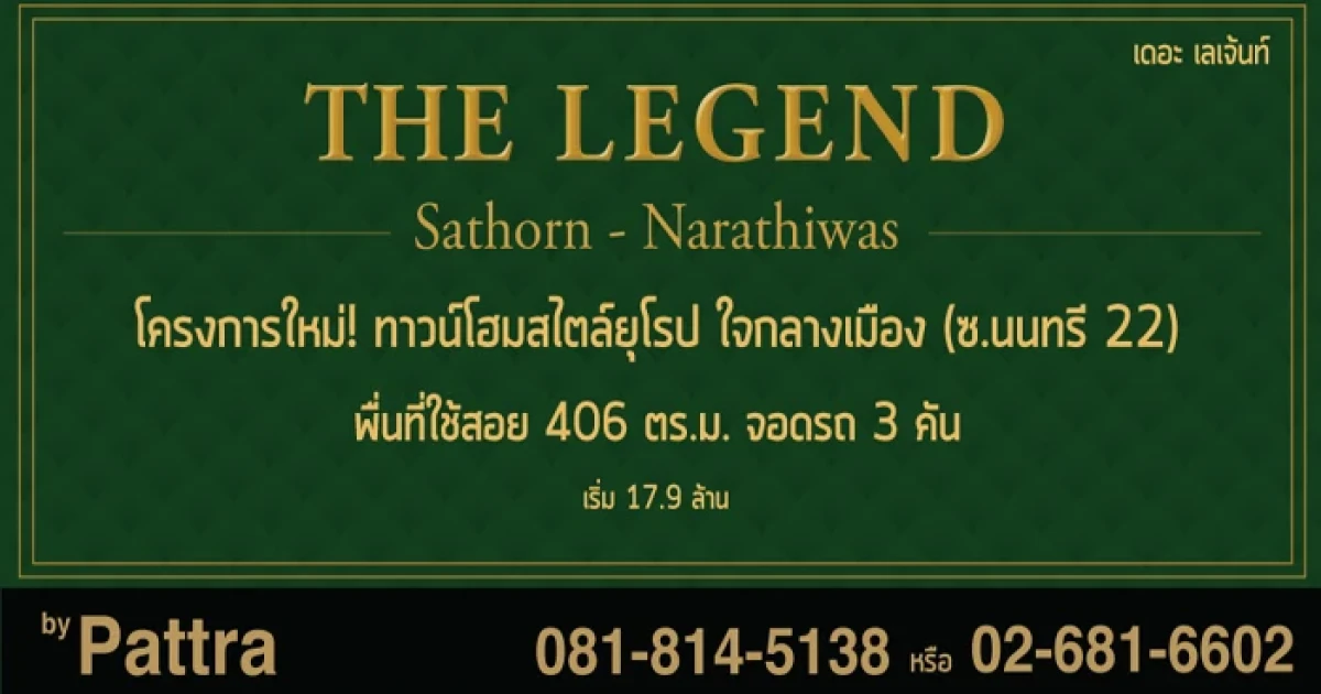 บริษัท ภัทราวิลล่า จำกัด ได้เปิดตัวทาวน์เฮ้าส์ ทาวน์โฮมโครงการใหม่ "เดอะ เลเจ้นท์ สาทร - นราธิวาส (The Legend Sathorn - Narathiwas)" ทาวน์โฮมสไตล์ยุโรปหลังใหญ่ ทำเลดีใจกลางเมือง พร้อมฟังก์ชั่นบ้านครบครัน ให้คุณได้สัมผัส ความสุขทุกพื้นที่ โครงการนี้มีลักษณะเป็นทาวน์โฮม 4 ชั้น พื้นที่โครงการ 3 ไร่ 19 ตารางวา มีแบบบ้าน 1 แบบ มีพื้นที่ใช้สอย 406 ตร.ม. 5 ห้องนอน 5 ห้องน้ำ 3 ที่จอดรถ ตั้งอยู่บนทำเลซอยนนทรี 22 ที่สามารถเข้า - ออกได้หลายทาง ไม่ว่าจะเป็นถนนพระราม 3 ถนนนราธิวาส หรือถนนรัชดาพระราม 3