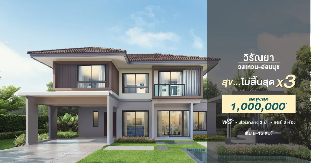 บริษัท เรียลแอสเสท ดีเวลลอปเม้นท์ จำกัด ส่งโปรโมชั่นพิเศษ สุข...ไม่มีสิ้นสุด x 3 กับโครงการ วิรัณยา วงแหวน - อ่อนนุช (Viranya Wongwaen - Onnut) บ้านเดี่ยว 2 ชั้น ทำเลอ่อนนุช - วงแหวน