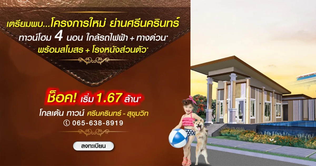 เตรียมพบ ทาวน์โฮม โครงการใหม่! จาก โกลเด้นแลนด์ "โกลเด้น ทาวน์ ศรีนครินทร์-สุขุมวิท (Golden Town Srinakarin - Sukhumvit)" จุดพลุสะท้านวงการ!! กับทำเลสุดฮอต เตรียมพบ โครงการใหม่ย่าน ศรีนครินทร์! ทาวน์โฮม 4 ห้องนอน 3 ห้องน้ำ ใกล้รถไฟฟ้า+ทางด่วน พร้อมสิ่งอำนวยความสะดวกมากมาย ทั้งสโมสร สวนธรรมชาติรอบโครงการ และโรงหนังส่วนตัว ท่านที่สนใจสามารถลงทะเบียนรับส่วนลดเพิ่ม 10,000 บาท* ได้ที่เว็บไซต์ของโกลเด้นแลนด์