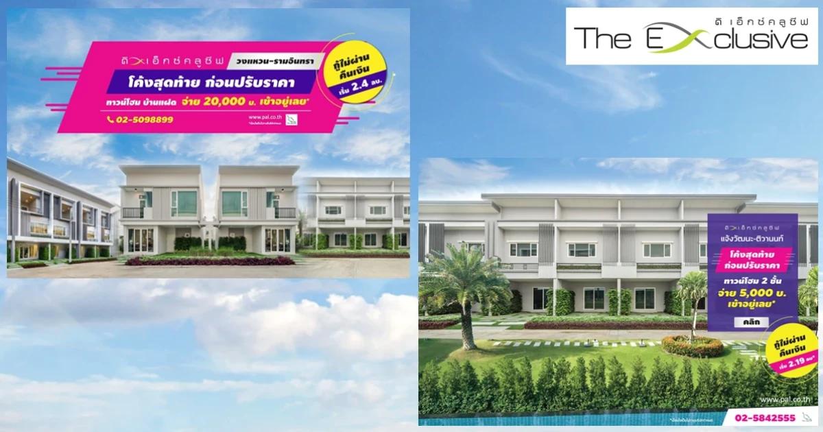 ดิ เอ็กซ์คลูซีฟ วงแหวน - รามอินทรา ทาวน์โฮม 2 ชั้น เพียง 2.40 ล้านบาท* ทาวน์โฮม 3 ชั้น 3 ห้องนอน 4 ห้องน้ำ เพียง 2.95 ล้านบาท* บ้านแฝด เริ่มเพียง 3.98 ล้านบาท* จ่าย 20,000 บาท เข้าอยู่ได้เลย* กู้ไม่ผ่านคืนเงิน รับเลยส่วนลดสูงสุด 7 แสนบาท!! พร้อมของแถมจัดเต็ม 10 รายการ!! คลิกลงทะเบียนรับส่วนลดเพิ่ม 10,000 บาท ภายในวันที่ 31 มกราคม 2561 นี้เท่านั้น !!