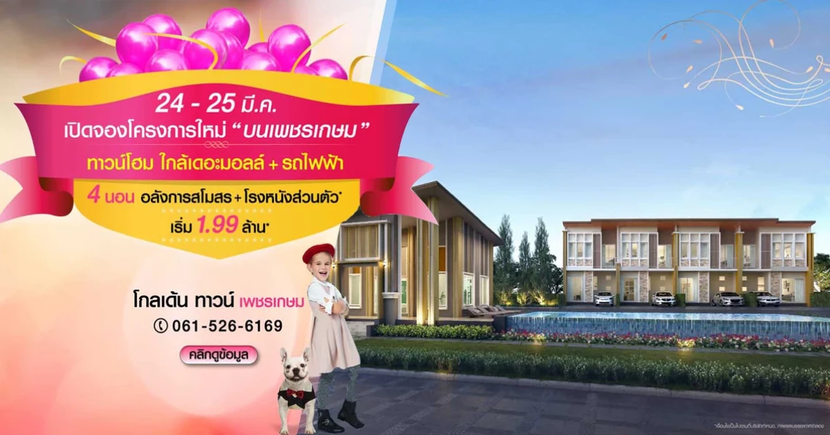 เปิดจอง "โกลเด้น ทาวน์ เพชรเกษม (Golden Town Phetkasem)" ทาวน์โฮม โครงการใหม่! จาก โกลเด้นแลนด์ 24-25 มีนาคม 2561 นี้ ชาวเพชรเกษมไม่ควรพลาด!! เตรียมพบ ทาวน์โฮม โครงการใหม่ บนทำเลศักยภาพ ใกล้เดอะมอลล์+รถไฟฟ้า กับทาวน์โฮม 4 ห้องนอน 3 ห้องน้ำ อลังการสโมสร+โรงหนังส่วนตัว พิเศษฟังก์ชันห้องพระ+ครัวไทย ท่านที่สนใจสามารถลงทะเบียนรับส่วนลดเพิ่ม 10,000 บาท* ได้ที่เว็บไซต์ของโกลเด้นแลนด์