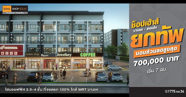 บริษัท เสนาดีเวลลอปเม้นท์ จำกัด (มหาชน) เปิดตัวโฮมออฟฟิศโครงการใหม่ "เสนา ช็อปเฮ้าส์ บางแค - เทอดไท (Sena Shophouse Bangkae - Terdthai)" โฮมออฟฟิศ 3.5 - 4 ชั้น แต่งเฟอร์ครบ พร้อมพื้นที่รองรับการจอดรถ 100% ตั้งอยู่ติดถนนเทอดไท ใกล้ MRT บางแค มาพร้อมโปรโมชั่นจัดเต็ม ยกทัพมอบส่วนลดสูงสุดถึง 700,000 บาท* ลงทะเบียนรับสิทธิพิเศษได้ที่ลิงก์ด้านล่างนี้่