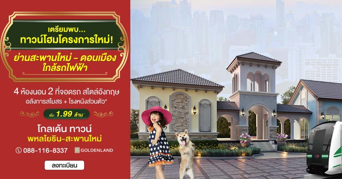 โกลเด้นแลนด์ เปิดให้จองโครงการใหม่ โกลเด้น ทาวน์ พหลโยธิน - สะพานใหม่ (Golden Town Phahonyothin - Sapanmai) เตรียมพบ ทาวน์โฮม โครงการใหม่ ย่านสะพานใหม่ - ดอนเมือง ใกล้รถไฟฟ้า กับ ทาวน์โฮมสไตล์อังกฤษ ที่ให้มากถึง 4 ห้องนอน 2 ที่จอดรถ พร้อมสโมสรและโรงหนังส่วนตัว ท่านที่สนใจสามารถลงทะเบียนจอง เพื่อรับส่วนลดพิ่ม 20,000 บาท* ได้ที่เว็บไซต์ของโกลเด้นแลนด์