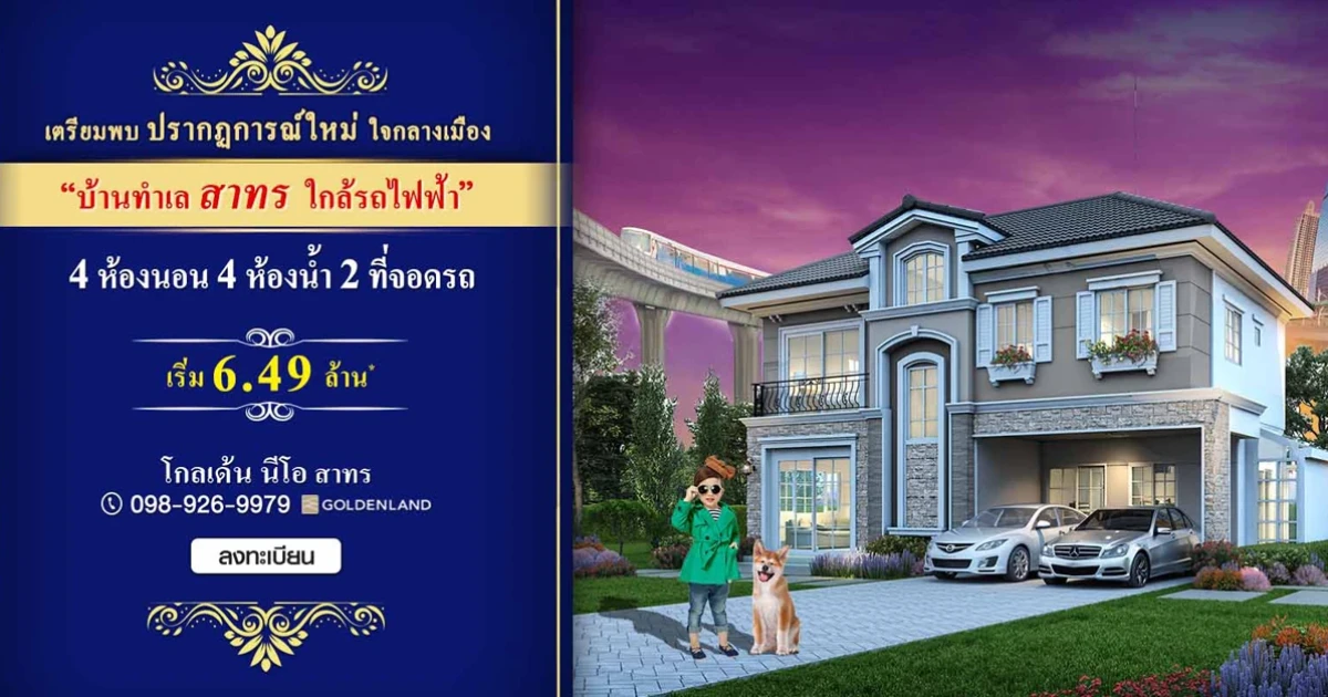 เตรียมพบ ปรากฏการณ์ใหม่ บ้านใจกลางเมือง!! จาก โกลเด้นแลนด์ โกลเด้น นีโอ สาทร (Golden Neo Sathorn) บ้านทำเลสาทร ติดถนนใหญ่ ใกล้รถไฟฟ้า พบกับบ้านหลังใหญ่ ขนาด 4 ห้องนอน 4 ห้องน้ำ 2 ที่จอดรถ ดีไซน์หรูหราสไตล์อังกฤษ อลังการสโมสรและสวนสวยธรรมชาติ ท่านที่สนใจสามารถลงทะเบียนรับส่วนลดเพิ่ม 30,000 บาท* ได้ที่เว็บไซต์ของโกลเด้นแลนด์