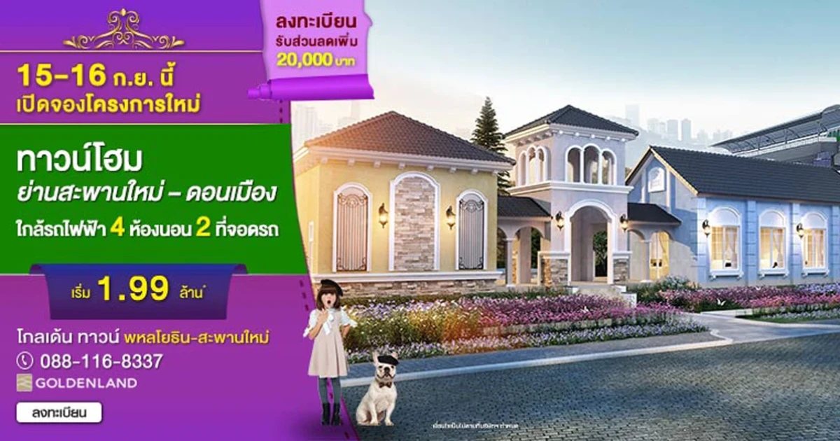 15-16 ก.ย. นี้ โกลเด้นแลนด์ เปิดจองโครงการใหม่ ย่านสะพานใหม่-ดอนเมือง กับ โกลเด้น ทาวน์ พหลโยธิน - สะพานใหม่ (Golden Town Phahonyothin - Sapanmai) เตรียมพบ ทาวน์โฮม โครงการใหม่ ย่านสะพานใหม่-ดอนเมือง ใกล้รถไฟฟ้า กับ ทาวน์โฮมสไตล์อังกฤษ ที่ให้มากถึง 4 ห้องนอน 2 ที่จอดรถ พร้อมสโมสรและโรงหนังส่วนตัว *ท่านที่สนใจสามารถลงทะเบียนจองเพื่อรับส่วนลดพิ่ม 20,000 บาท* ได้ที่เว็บไซต์ของโกลเด้นแลนด์
