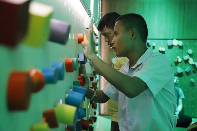ตัวห้องเรียนที่ออกแบบนั้น ทางผู้อำนวยการได้เลือกห้องสมุดที่มีผนัง 6 ด้าน ทางเราใช้ความรู้ด้านการออกแบบผสานกับหลักสูตรพรีเบรลล์ (Pre-Braille) ทำให้ทั้งห้องสามารถใช้เรียนรู้ได้รอบด้าน อันนี้เราก็เริ่มโดยไม่มีโต๊ะ ไม่มีเก้าอี้ แล้วก็มีผนังให้เด็กไปเกาะกับผนัง เล่นกับผนัง หมุด ตัวหมุดก็จะมีหลักสูตรต่างกัน มีอยู่ 6 แบบตามผนัง 6 ด้าน ตัวหมุดด้านแรก จะเริ่มที่ระเบียงก่อน ตัวหมุดจะมีขนาดเท่าๆ กัน แล้วก็เป็นรูปทรงมาตรฐาน ทรงกลม ทรงเหลี่ยม สามเหลี่ยม ผนังที่สองก็เป็นเรื่องขนาดเริ่มต่างกัน แล้วก็มีตัวเลขให้นับ ผนังต่อไป ก็จะเป็นตัวหมุดมีเสียงอยู่ข้างใน เพราะว่าพอเราเริ่มจากสัมผัสแล้ว เราก็เริ่มพัฒนาสัมผัสอื่นๆ ที่เด็กมีนอกจากการมองเห็น ได้ยิน ได้กลิ่น แล้วก็เสียงที่เราใช้ในหมุด ก็จะเป็นของในชีวิตประจำวัน เช่น เกลือ พริกไทย อันนี้ประหลาดใจมาก ที่เด็กสามารถเขย่าพริกไทย เขย่าเกลือ แล้วแยกแยะได้ว่ามันไม่เหมือนกัน