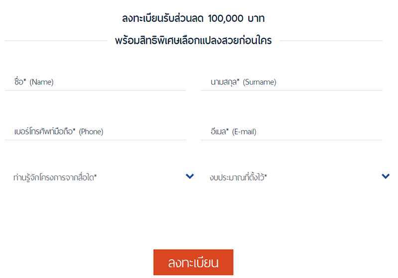 ลงทะเบียนรับส่วนลด 100,000 บาท พร้อมสิทธิพิเศษเลือกแปลงสวยก่อนใคร
