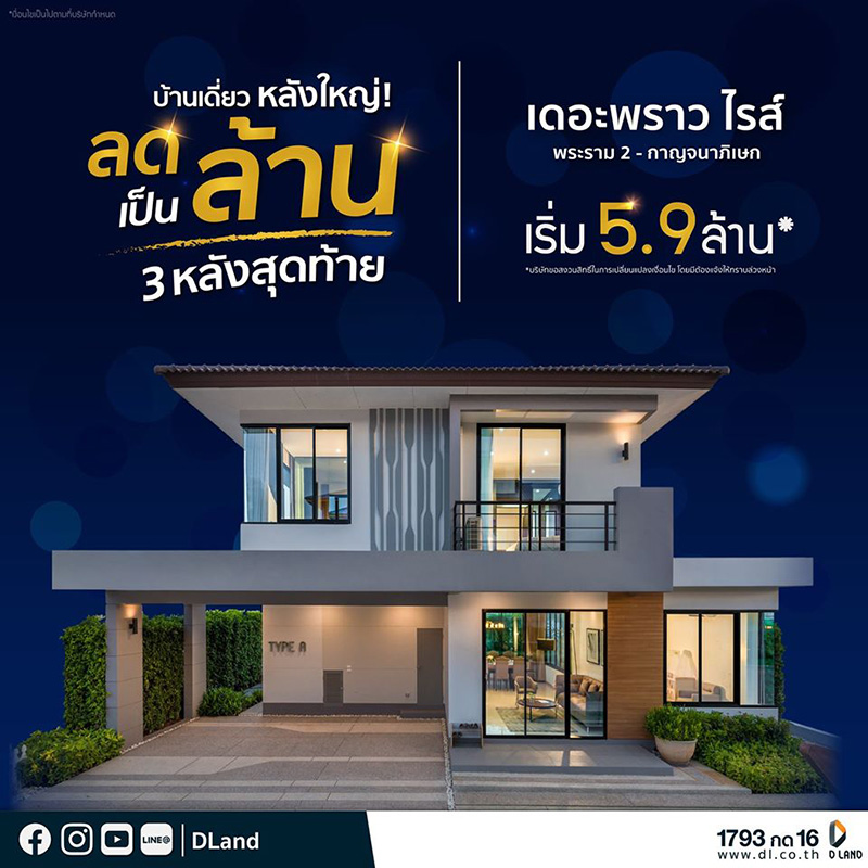 สอบถามข้อมูลเพิ่มเติมหรือสนใจเยี่ยมชมโครงการ ติดต่อสำนักงานขาย โทร. 1793 กด 16 เว็บไซต์ : https://dl.co.th