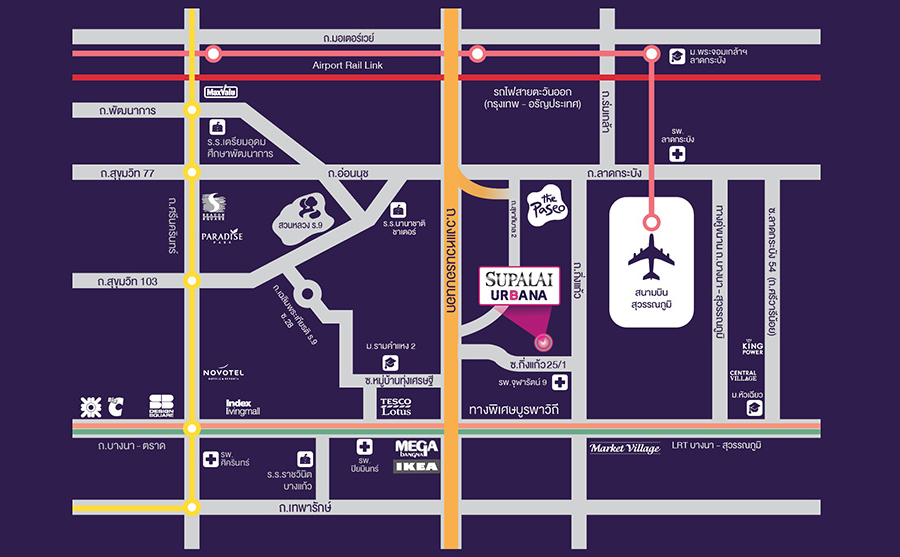 "ศุภาลัย เออร์บานา บางนา - วงแหวน (Supalai Urbana Bangna - Wongwaen)" ตั้งอยู่และเชื่อมต่อทั้ง ถนนกิ่งแก้ว และถนนวงแหวนรอบนอก สะดวกทุกการเดินทางสู่ใจกลางแหล่งธุรกิจ ใกล้ทางด่วน ใกล้รถไฟฟ้า Airport Rail Link และ LRT บางนา-สุวรรณภูมิ (ในอนาคต) รายล้อมด้วยสิ่งอำนวยความสะดวก และแหล่งช้อปปิ้งครบครัน