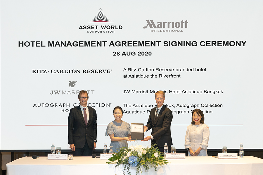 แอสเสท เวิรด์ คอร์ปอเรชั่น หรือ AWC ผู้พัฒนาอสังหาริมทรัพย์ชั้นนำของไทยที่มุ่งเน้นตอบสนองไลฟ์สไตล์แบบครบวงจร ร่วมลงนามครั้งสำคัญกับ แมริออท อินเตอร์เนชั่นแนล (Marriott International) เตรียมเดินหน้าแผนพัฒนาครั้งใหม่ในการเสริมสร้างความหลากหลาย ของพอร์ตโฟลิโอโรงแรมและสถานที่ท่องเที่ยวแนวไลฟ์สไตล์ ด้วยการนำ 3 แบรนด์โรงแรมระดับโลกมาสู่ย่านริมแม่น้ำเจ้าพระยาในกรุงเทพฯ และริมชายหาดพัทยา ซึ่งการร่วมมือครั้งนี้ถือเป็นการต่อยอดความร่วมมือกับแมริออท อินเตอร์เนชั่นแนล ซึ่งเป็นเครือโรงแรมที่มีจำนวนห้องพักมากที่สุดในโลก เพื่อเตรียมความพร้อมสร้างความแข็งแกร่งยกระดับการท่องเที่ยวของประเทศ รวมทั้งอุตสาหกรรมโรงแรมไทยให้โดดเด่นน่าจับตามอง ดึงดูดนักท่องเที่ยวทั่วโลกมาสู่ประเทศไทย ทั้งการเดินทางเพื่อธุรกิจ และการพักผ่อนหย่อนใจ เพิ่มศักยภาพให้ AWC เป็นหนึ่งในเจ้าของโรงแรมแบรนด์ในกลุ่ม แมริออท อินเตอร์เนชั่นแนลรายใหญ่ที่สุดในเอเชีย แปซิฟิค (ยกเว้นประเทศจีน) ด้วยจำนวนห้องพักรวม 6,636 ห้อง จากโรงแรมที่เปิดดำเนินการแล้วทั้งสิ้น 9 แห่ง รวมห้องพักทั้งหมด 3,452 ห้อง และโรงแรมที่อยู่ระหว่างการพัฒนา 7 แห่ง (รวม 4 โรงแรมในสัญญาสำคัญครั้งนี้จำนวน 1,638 ห้อง) ด้วยจำนวนห้องพัก 3,184 ห้อง